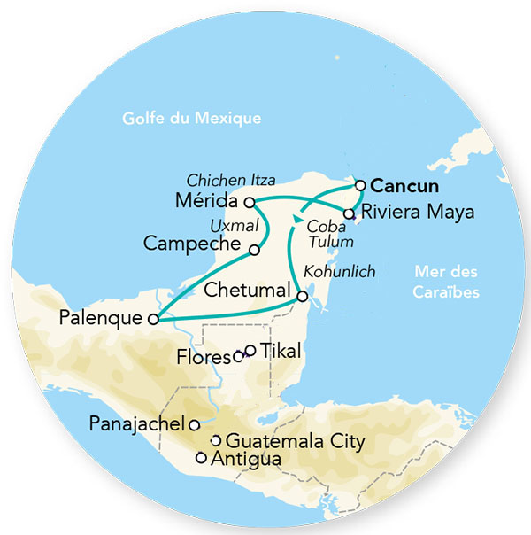 Départ pour Tulum, visite du site archéologique surplombant une plage scintillante aux eaux turquoise. La taille modeste des édifices, leur architecture postclassique, les ornements ne rivalisent pas avec d’autres constructions plus ambitieuses, mais l’emplacement est grandiose. Les iguanes sont les véritables maîtres des lieux. Continuation vers Coba, visite guidée à vélo du site enfoui dans la forêt. Cité prestigieuse, elle fait maintenant l’objet de fouilles attentives qui ont permis de dégager une pyramide haute de 42 m, un bastion étagé de neuf terrasses et un jeu de pelote. Route vers le sud de l’état du Quintana Roo. Arrivée à Chetumal. (P.déj-Déj-Dîn).