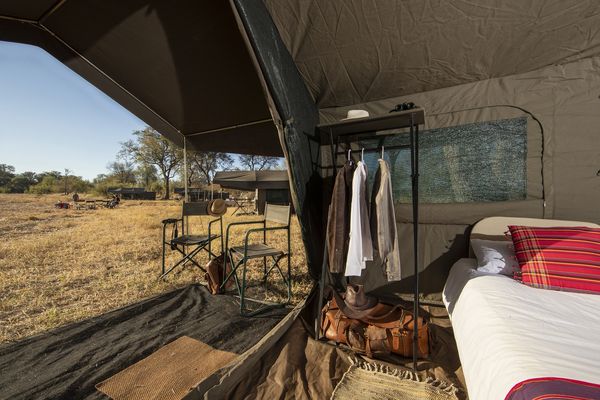 Logement en camp de brousse Grand Confort toujours installé sur des sites de camping privés: tente spacieuse (4m x 3m x 2,50m) avec auvent (2m x 2,5m), larges fenêtres avec moustiquaire, l’ensemble de couchage complet (lit, matelas, literie, couette, oreiller, et bouillote en hiver) + mobilier + tapis + éclairage + chaises de safari; espace sanitaire privé “En-suite” (2m x 2,5m) avec douche (eau chaude) et toilettes sèches ; table, bassine, miroir, serviette de toilette (petite) et serviette de bain (large).