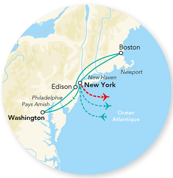 Départ vers Newport, ville portuaire qui regorge de trésors cachés. Sa visite donne parfois l’impression de se plonger dans l’univers de Gatsby le magnifique. Les demeures sont d’un autre monde ; et les magnifiques yachts et navires vont et viennent dans les ports, les élégants manoirs victoriens sont légion. En effet, au XIXe siècle, c'est dans cette ville du Rhode Island que les riches industriels américains ont établi leurs « résidences d'été ». Poursuite vers New York, surnommée « Big Apple », c'est aujourd'hui la plus importante agglomération du pays ; la capitale mondiale de la finance, des affaires et du commerce et le siège des Nations Unies. Cette ville est unique tant par sa diversité culturelle, économique et politique. (P.déj-Dîn).