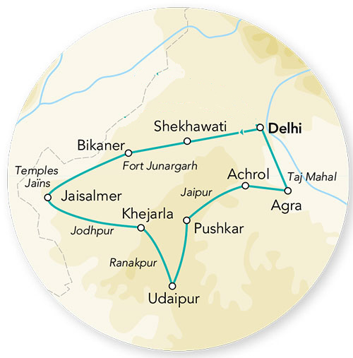 Départ vers Jaipur . Visite de la « Ville rose », l’une des villes les plus colorées et les plus pittoresques de l’Inde. On y visite le « City Palace », le palais du Maharadjah, connu pour ses armes et le « Jantar Mantar » , étonnant observatoire. Déjeuner dans une haveli avec spectacle de marionnettes. Promenade en rickshaw dans le bazar animé. Départ pour Achrol. (P.déj-Déj-Dîn).