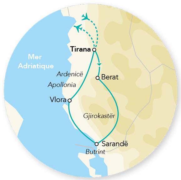 La région de la Riviera Albanaise est considérée comme l’une des plus belles d’Albanie, typique méditerranéenne. Les oliviers et la couleur bleu-turquoise nous accompagneront aujourd’hui. Les montagnes rencontrent la mer, les paysages y sont splendides. En route vous allez traverser les villages petits et typiques du sud. Arrêt à la baie de Porto Palermo, où se trouve la forteresse du fameux Ali Pacha d’Ioannina, personnage célèbre gouverneur de la région aux temps de l’Empire ottoman et réputé pour ses stratégies et alliances militaires identiques à celles de Napoléon. Ce petit château triangulaire était une des nombreux châteaux du grand Pacha ! La splendide baie de Porto Palermo a servi de base sous-marine importante pendant le régime communiste. Aujourd’hui semi-abandonnés, la base, son tunnel et les structures sont encore visibles. Déjeuner au cours de route. Continuation pour Vlora, une ville côtière, connue pour être un des ports les plus importants du pays. C’est aussi un lieu important pour la nation albanaise, car c’est à Vlorë qu’a été proclamée l’indépendance du pays le 28 novembre 1912 par Ismaïl Qemal. La baie de Vlora était depuis toujours un point stratégique d’une grande importance. Sur une colline qui domine la ville, on trouve le site religieux des Bektachî de "Kus Baba". De là, nous admirerons la mer et profiterons d’un panorama sur toute la ville. (P.déj-Déj-Dîn).