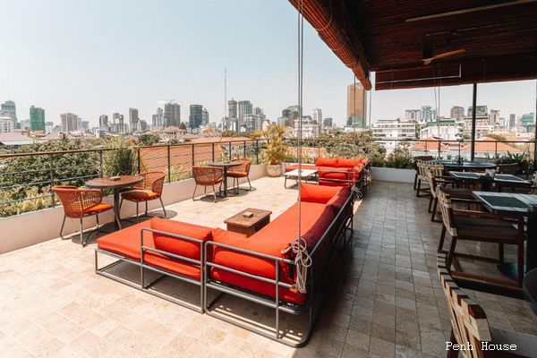 Le Penh House Jungle propose un restaurant moderne offrant une cuisine fusion asiatique et internationale, ainsi qu’un bar en rooftop avec vue panoramique sur la ville.