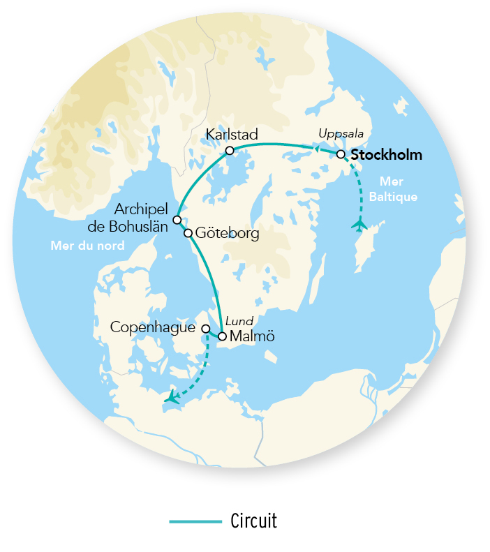 Direction Marstrand, pour découvrir l’une des plus belles villes de la côte. Elle est célèbre pour son yachting et est devenue la capitale de la voile en Suède. Petite traversée sur un bac pour une balade sur l’ile, dans les ruelles du village ou autour de la forteresse de Carlsten. Route vers Göteborg, seconde ville de Suède. Visite guidée de 2h avec la célèbre place Götaplatsen, inaugurée pour l’exposition universelle de 1923. Elle est entourée par de magnifiques monuments, tels que le Concert Hall, le théâtre de la ville ou le musée d’art. En son centre trône une statue de Poséidon sculptée par Carl Milles en 1931 et devenue symbole de la ville. Vous découvrirez également de nombreux édifices Vasakyrkan, Kronhuset datant de 1700, Skansen Lejonet, Christinæ Kyrka ou le nouvel Opéra. Nuit en centre-ville de Göteborg. (P.déj-Déj).